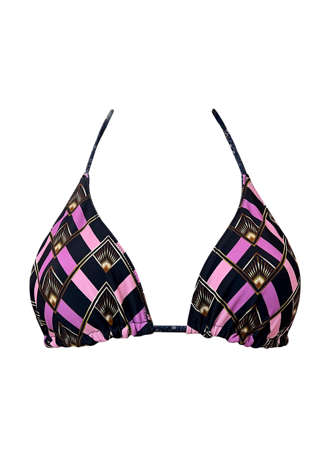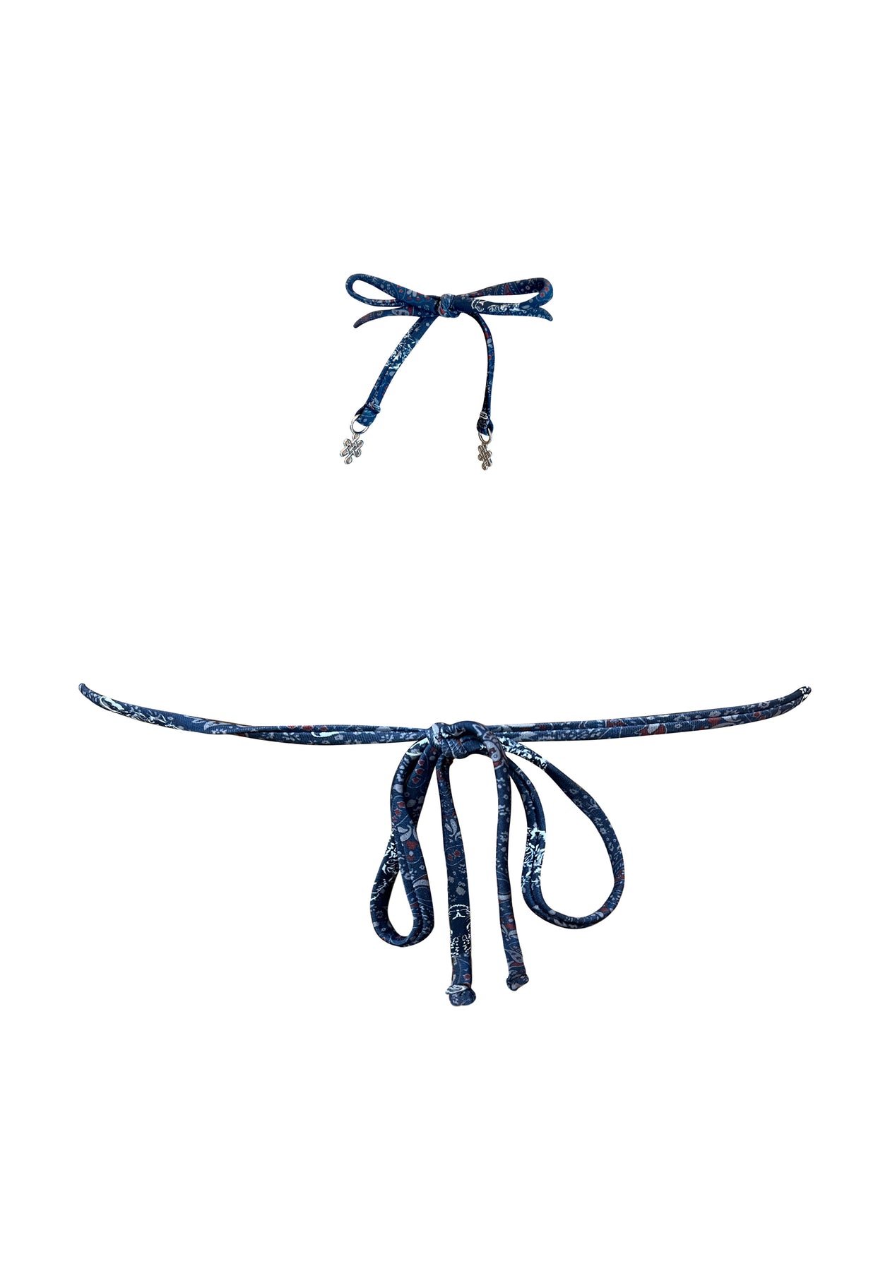 Our bikini top triangle in dark navy blue with a striking panther and paisley print is a true standout. Featuring banded details and our signature Kaanda touches, it offers a perfect blend of style and comfort.