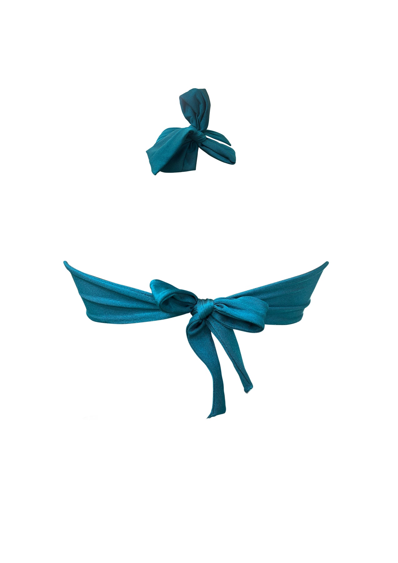 In a glossy petroleum colored fabric that is the perfect mix of green and blue.