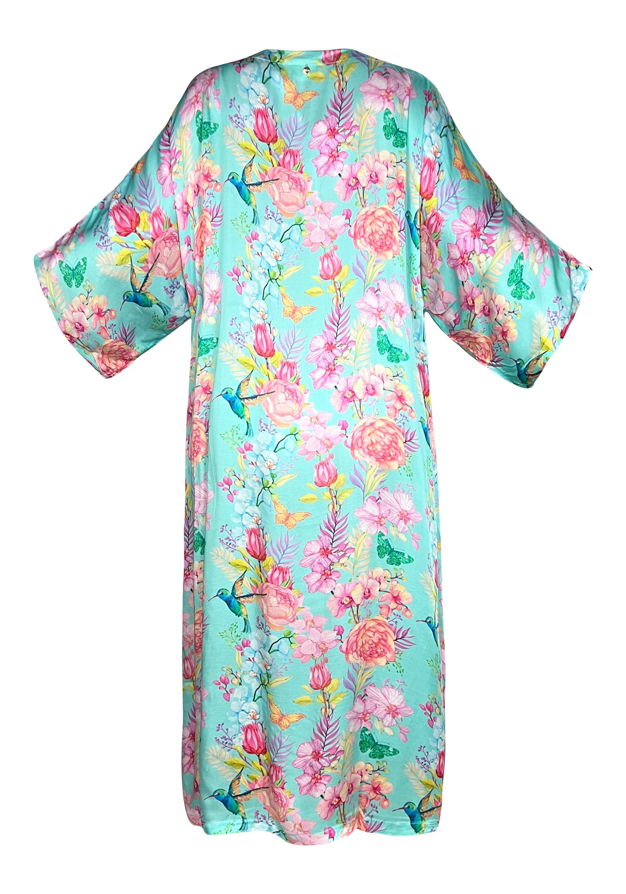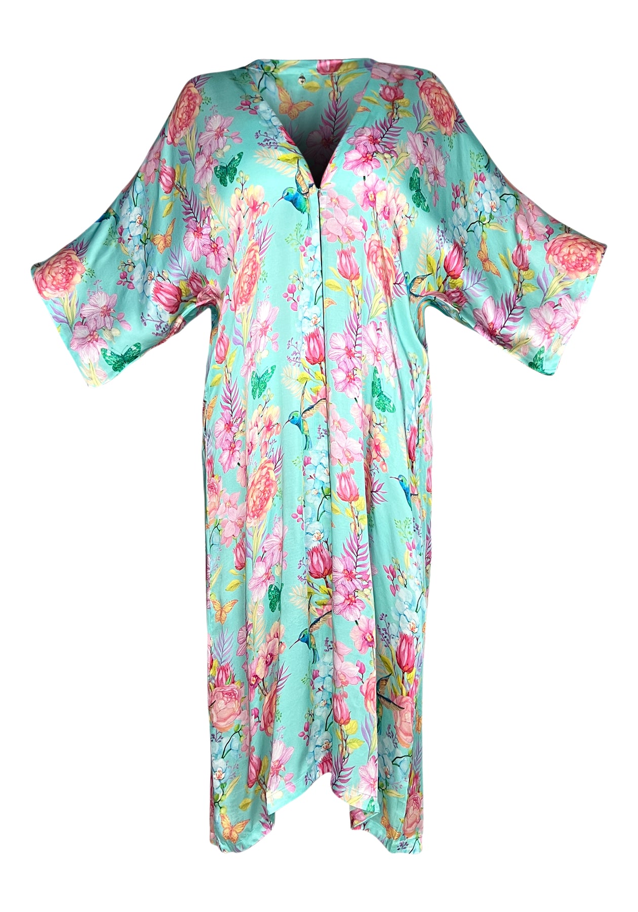 Where fluidity meets floral fantasy, Kaanda's midi kimono takes flight in a mesmerizing display of movement and grace. Against a canvas of ethereal aqua, a garden comes alive :coral-hued blooms and delicate pink florals dance with every step, creating a kinetic artwork that transforms resort dressing into performance art.