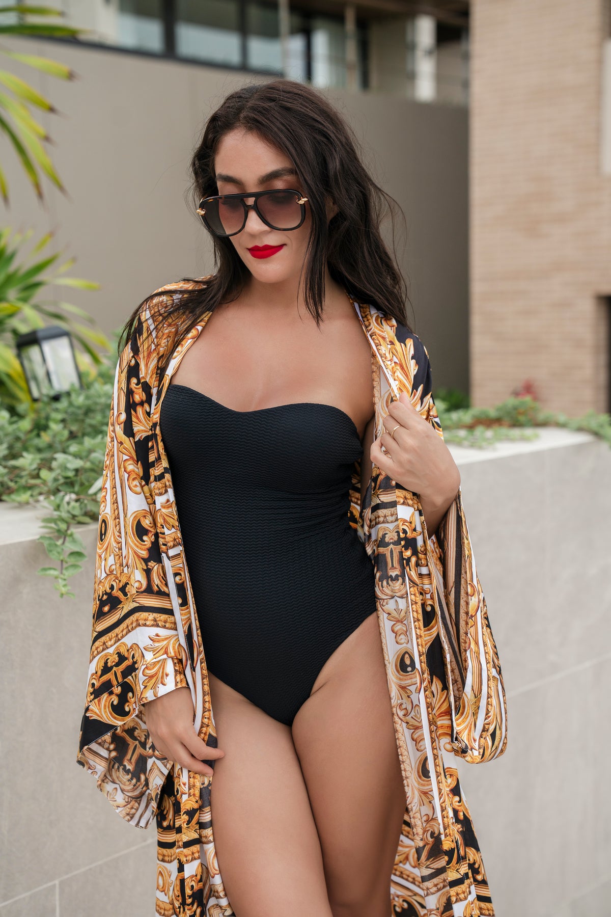 Layer it over the Giovanna Lace-Up One-Piece or the Giovanna bikini sets for a powerful, iconic look. It also pairs beautifully with our Jet Black swimwear . Add gold jewelry and oversized sunglasses for pure Kaanda glamour.